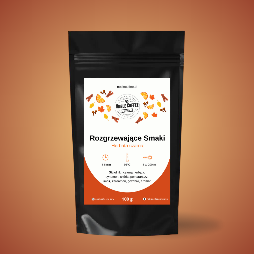 Czarna herbata „Rozgrzewające smaki” z aromatycznymi przyprawami to idealna propozycja dla miłośników korzennych napojów. Mieszanka liści czarnej herbaty z cynamonem, skórką pomarańczy, imbirem, kardamonem i goździkami zachwyca intensywnym aromatem i pełnym smakiem.